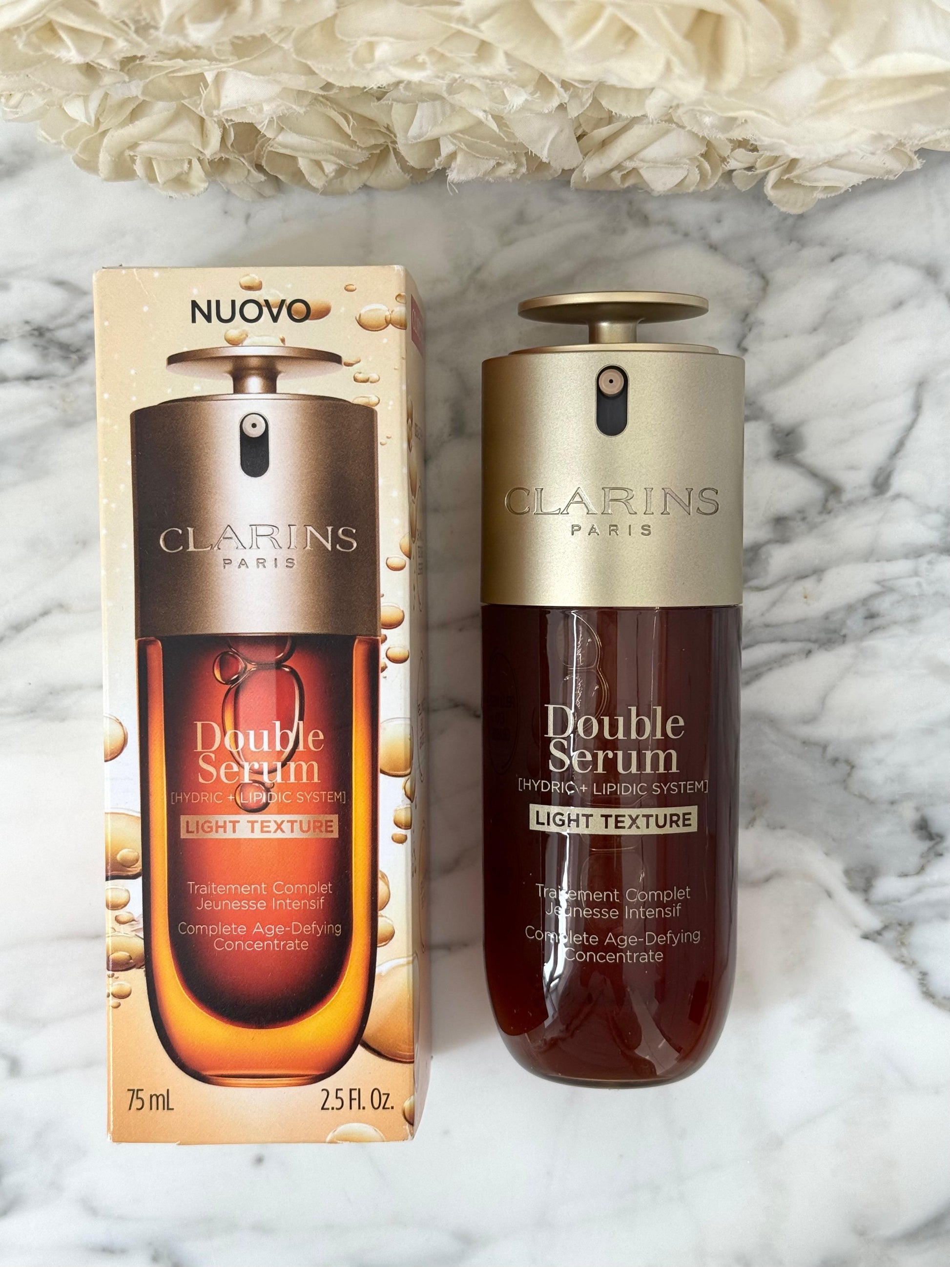Clarins Double Serum mbështetet nga 5 vjet kërkime epigjenetike, duke u fokusuar në mënyrën se si stili i jetesës ndikon në plakjen e lëkurës. Teknologjia e saj unike Epi-ageing Defense i neutralizon këto efekte në nivel qelizor, duke rritur funksionet natyrore të lëkurës. Me formulën e tij dyfazore, hidratues dhe të pasur me lipide, ky serum jep në mënyrë optimale përbërësit e tij të fuqishëm për rezultate të vërtetuara shkencërisht kundër plakjes.