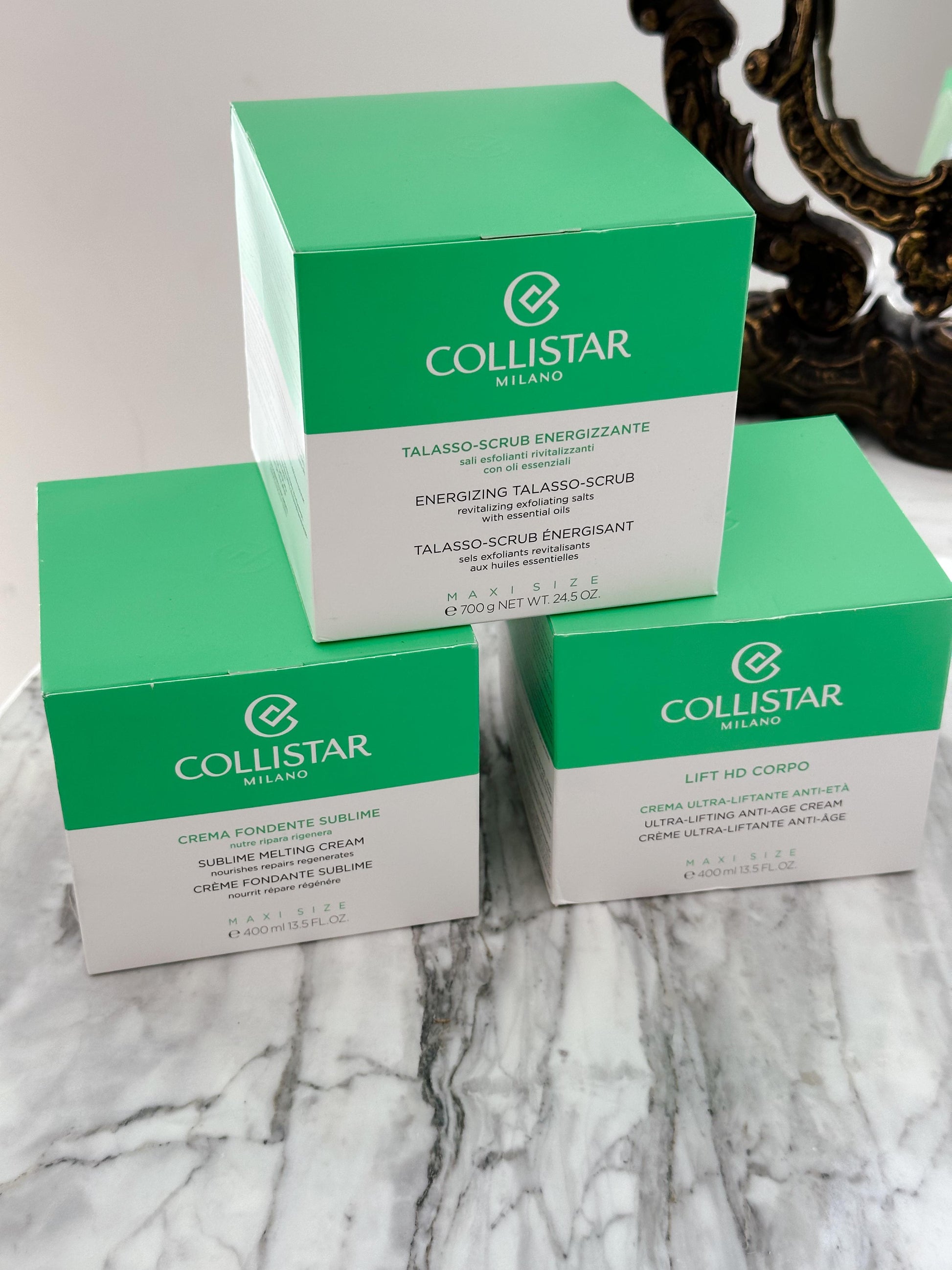 Nga Collistar Clean Research®, një trajtim i gjithanshëm me efekt të trefishtë për shenjat kryesore të plakjes në trup - indet e dobësuara, qëndrueshmëria e humbur dhe toni i pabarabartë i lëkurës - veçanërisht për pjesën e brendshme të krahëve, pjesën e brendshme të kofshëve, gjunjëve dhe dekoltesë. Falë formulës së tij të përforcuar, zbut, rikompakt, rigjallëron dhe ndriçon lëkurën, duke e lënë atë dukshëm më të njëtrajtshme dhe duke dhënë një efekt të fuqishëm antioksidant. Për një trup me definicion të lartë. Efekti ngritës i menjëhershëm dhe afatgjatë Tens-Activ, një kompleks me bazë bimore, e mbështjell trupin në një matricë 3D, duke krijuar një rrjetë tensori të padukshme me një efekt ngritës të menjëhershëm. Me kalimin e kohës jep një veprim rigjenerues, rigjallërues, kundër moshës. Efekti i rritur kundër moshës Exclusive Lift HD Body Complex kombinon një tetrapeptid bioaktiv me një ekstrakt të fuqishëm të mikroalgave të qëndrueshme për të rifilluar aktivitetin dermal-epidermal, për të rritur prodhimin e fibroblasteve dhe për të stimuluar sintezën e kolagjenit dhe elastinës, duke rikthyer qëndrueshmërinë dhe elasticitetin tipik të lëkurës së re. Një efekt antioksidant i përforcuar, ndriçues dhe i mbrëmjes Collistar Clean Research® ka shtuar gjithashtu në formulë Oriz Italian të Hiper-Fermentuar. E qëndrueshme duke qenë se është një nënprodukt i orizit të rritur në Luginën e Po, ai i nënshtrohet një procesi inovativ, të patentuar për të rritur efektin e tij antioksidues, anti-inflamator dhe ndriçues me 20%. Papaina eksfolon butësisht lëkurën për të përshpejtuar qarkullimin e qelizave, perfeksionon strukturën e saj dhe minimizon papërsosmëritë, duke e lënë atë më të lëmuar dhe më të shndritshme; Acidi Etil Askorbik - një formë e gjeneratës së ardhshme të vitaminës C - mbron epidermën nga efektet e dëmshme të radikalëve të lirë, parandalon melanogjenezën dhe stimulon prodhimin e kolagjenit. Me aromën e tij mbështjellëse dhe shkrirjen, teksturën ndijore, kremi jo i yndyrshëm ushqen dhe hidraton lëkurën në thellësi falë acidit hialuronik, arganit dhe vajrave jojoba. Për të gjitha llojet e lëkurës, duke përfshirë edhe ato të ndjeshme; ideale për indet e dobësuara, rrudhat e imëta dhe tonin e pabarabartë të lëkurës. Rezultatet Sapo aplikohet, kremi e lë lëkurën të lëmuar, të lëmuar, të butë dhe të hidratuar. Me trajtim të vazhdueshëm, struktura e lëkurës ristrukturohet dhe uniformohet, epiderma bëhet më e fortë dhe më elastike dhe zonat kritike duken më të tonifikuara dhe me ngjyrë më të njëtrajtshme. Për një trup më të ri, të rinovuar.