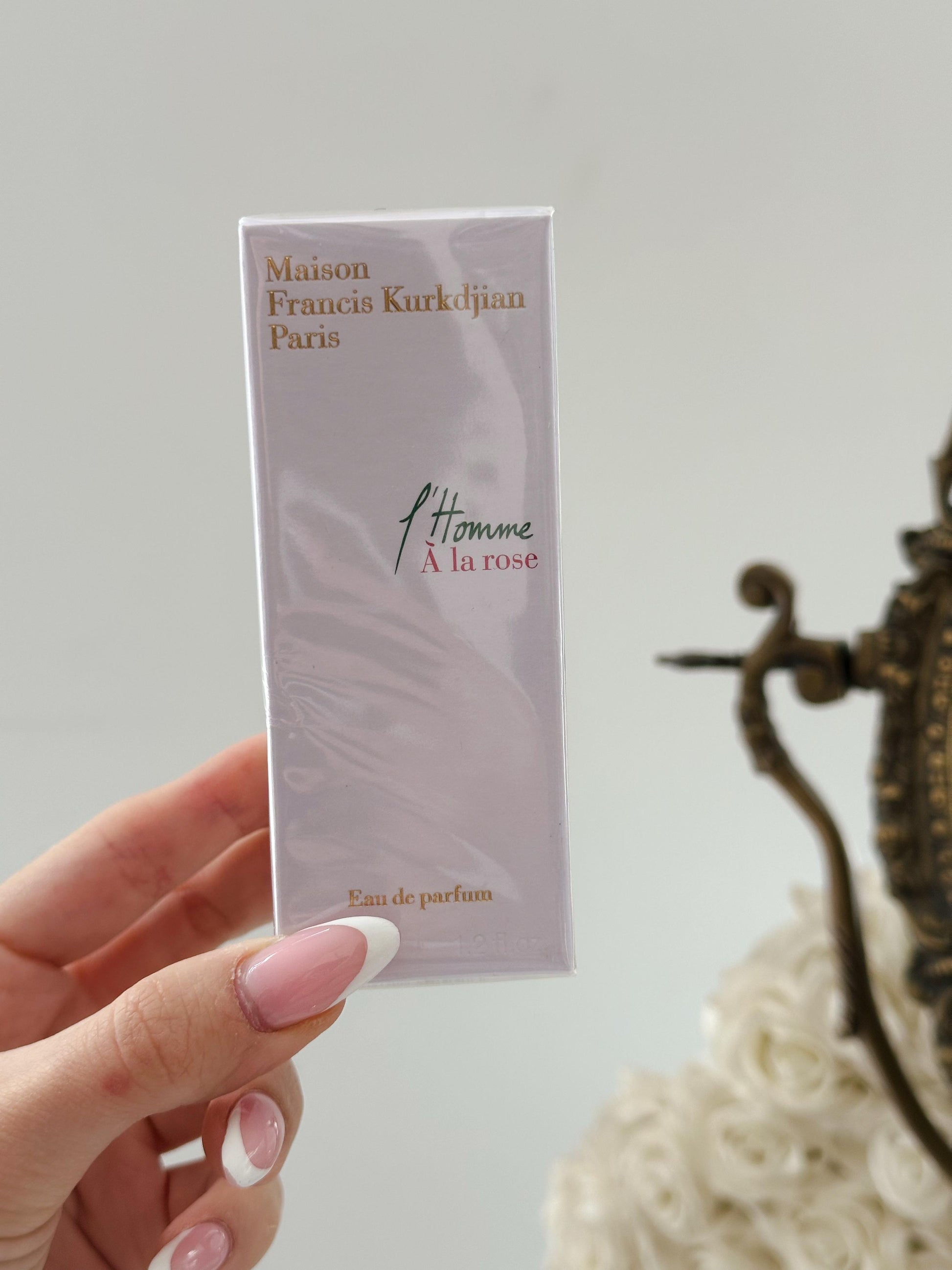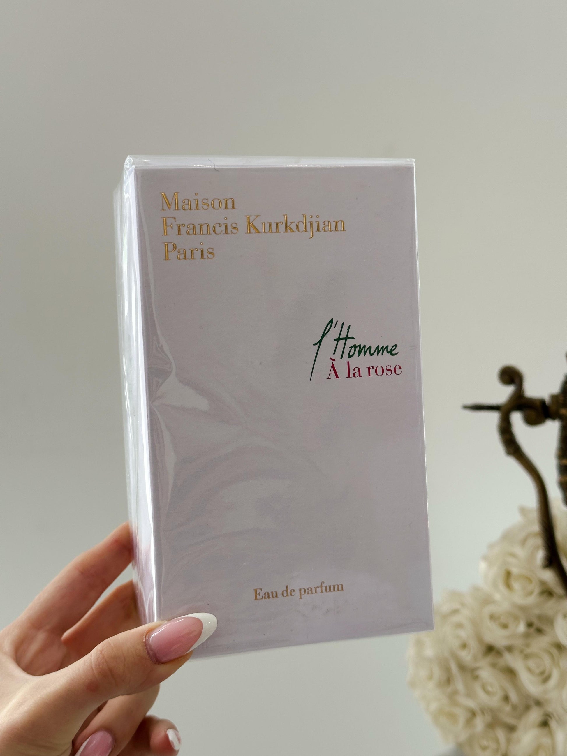 Francis Kurkdjian riinterpreton trëndafilin me ngjyrime mashkullore për t'ju sjellë l'Homme À la rose eau de parfum për meshkuj. Menjëherë, notat jeshile të freskëta intensive të grejpfrutit shkrihen me esencën e trëndafilit Damascena. Kjo forcë natyrale dhe jetike i lë vendin notave të zemrës rozë dhe drunore, të cilat gradualisht përforcohen me anë të drurit qelibar duke lënë një gjurmë sensuale. Me këtë eau de parfum të freskët dhe të lehtë l'Homme À la rose, Francis Kurkdjian i sjell njeriut të sotëm fuqinë për të veshur një trëndafil.