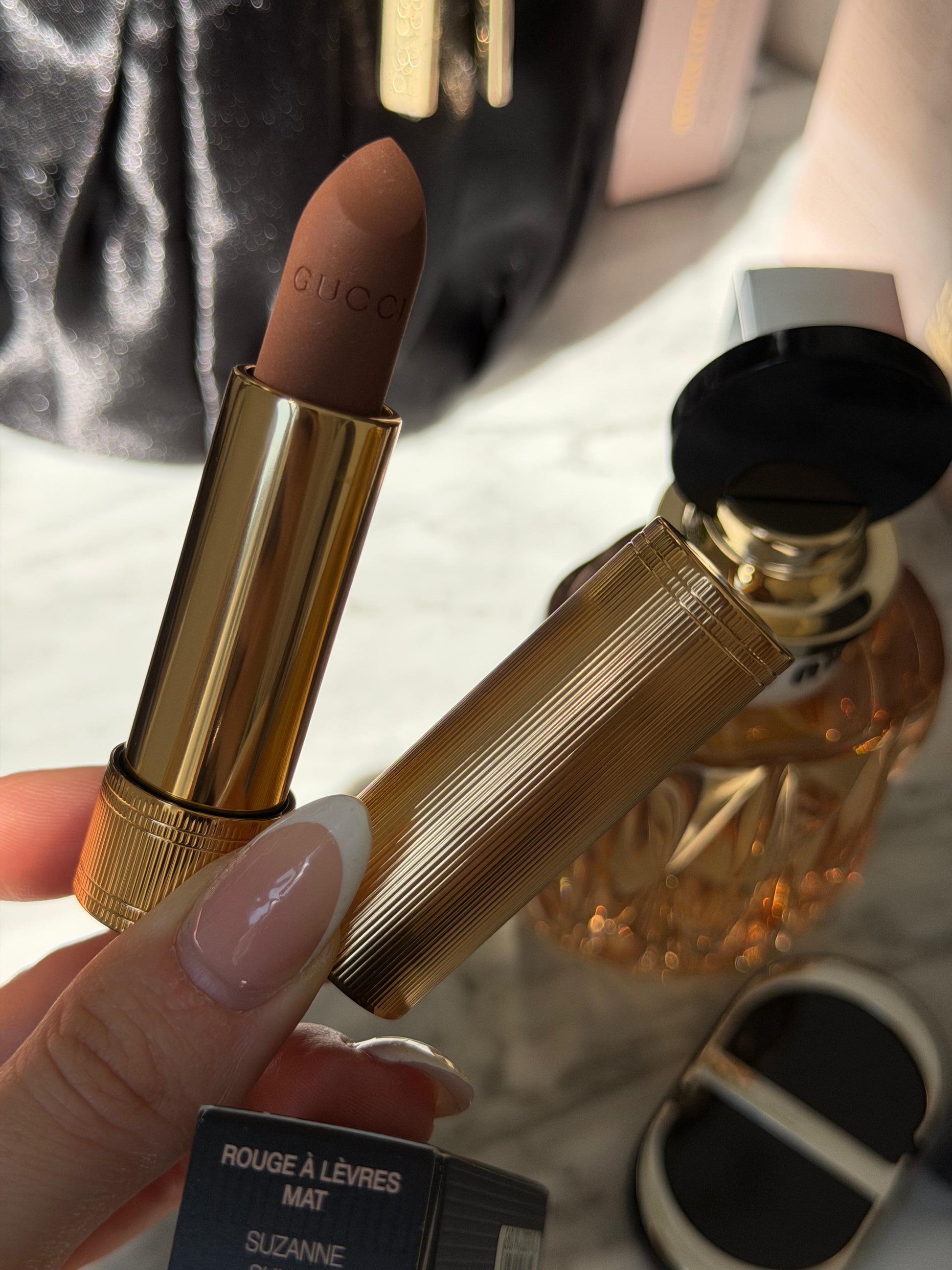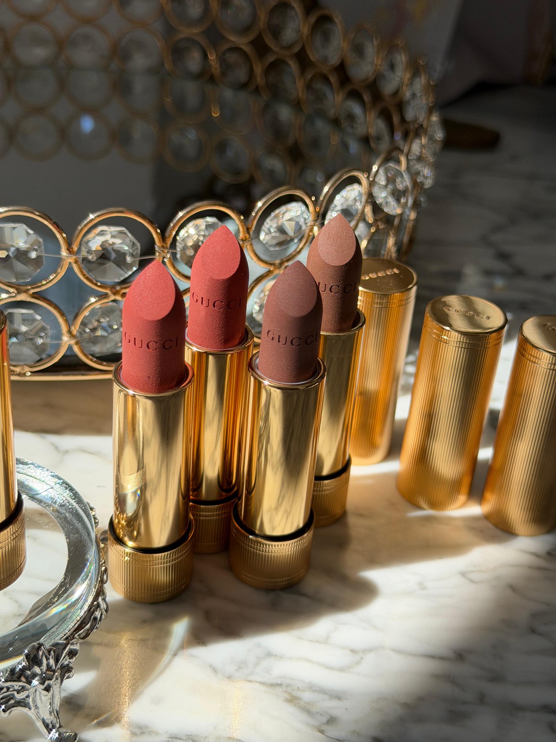 I stolisur me një kuti të artë, buzëkuqi Saten është i gdhendur me një stil dekorativ të dizenjuar nga Alessandro Michele i cili e ka huazuar frymëzimin e tij nga Art Deco.