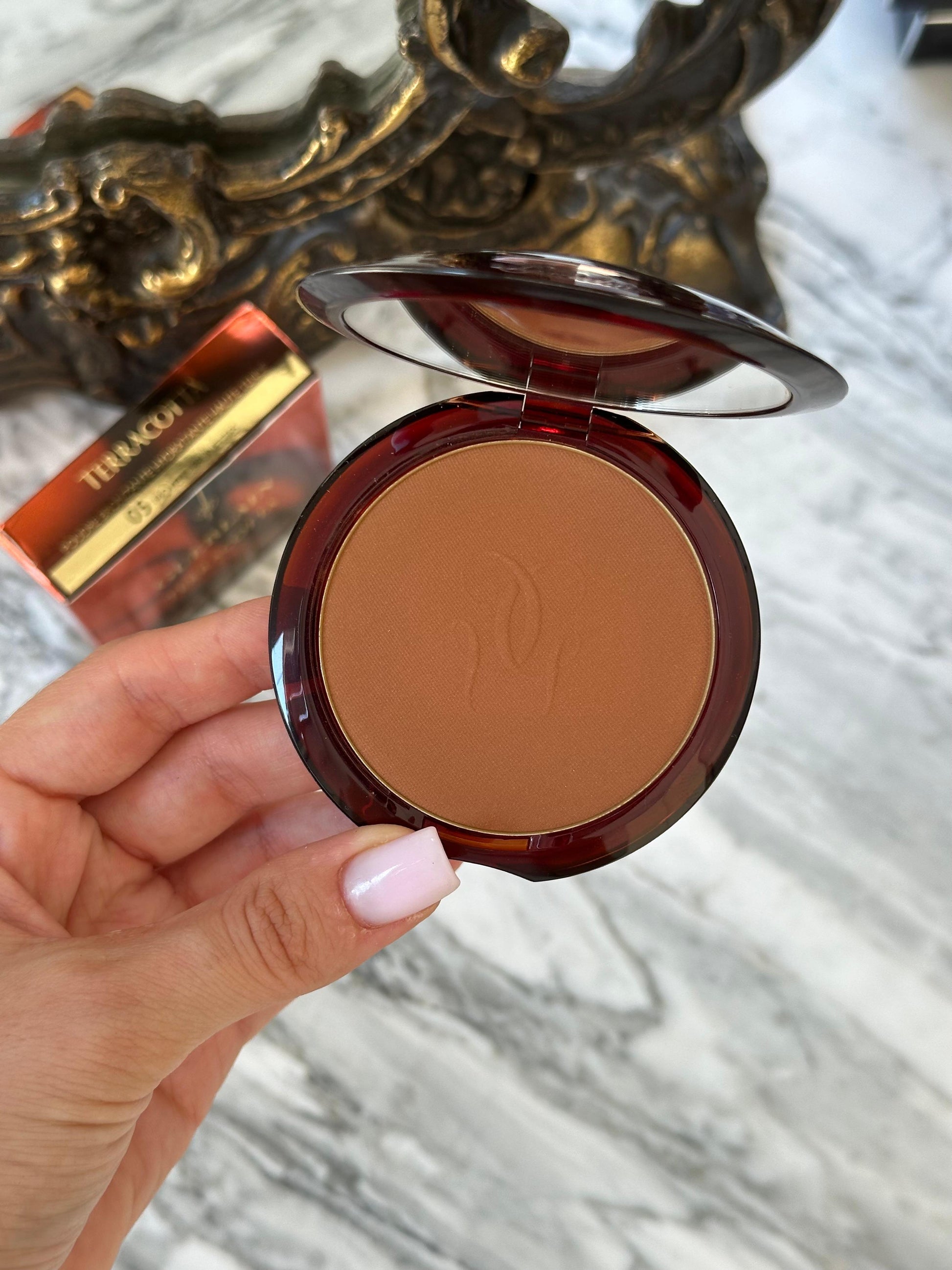 Pluhuri legjendar i Bronzimit Terrakota, tani i rimbushshëm, rikrijon një shkëlqim të pastër të bronzit të vërtetë në lëkurë në një hap të thjeshtë dhe të menjëhershëm. Me 96% përbërës me prejardhje natyrale¹, duke përfshirë pigmente dhe shkëlqim lumineshent, tekstura e saj shkrihet menjëherë me lëkurën për të siguruar një shkëlqim të përsosur të lëkurës. E mbushur me vaj argan natyral maroken, i njohur për vetitë e tij ushqyese, formula e tij ruan nivelet e lagështisë së lëkurës për rehati afatgjatë.