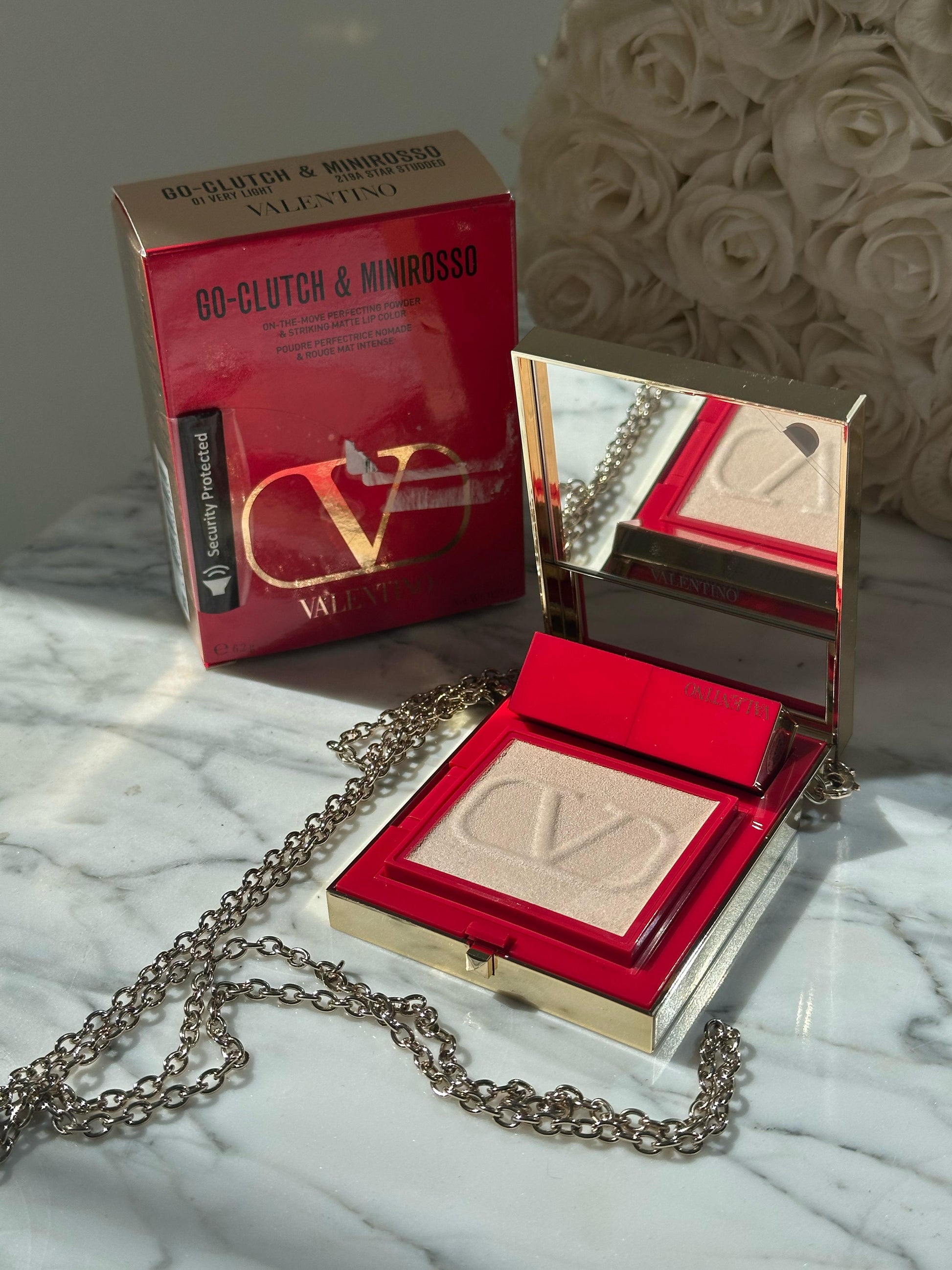 Një tufë kompakte luksoze e rimbushshme për ta mbajtur me vete për makijazh në lëvizje. Zinxhiri i lëvizshëm ju jep mundësinë për të mbajtur trupin e kryqëzuar, kështu që ju mund ta fusni vetë në çantën tuaj ose ta vishni me zinxhirin në stilin e vërtetë Valentino.