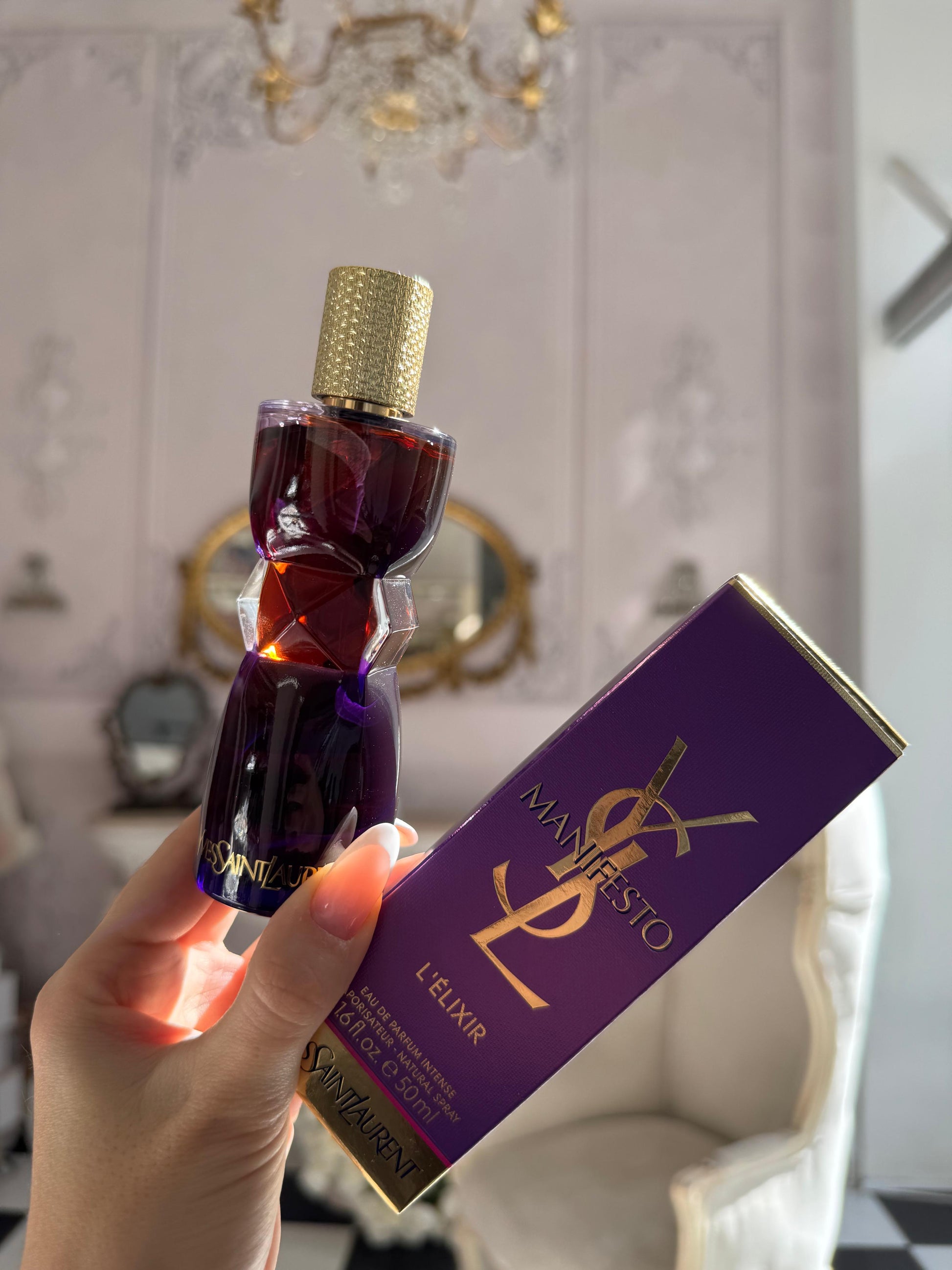 Me Manifesto L’Elixir, guximi rrezaton nga të gjitha aspektet e tij të shumëfishta. I zbukuruar nga një kapak ari i skalitur si xhevahir, silueta e shishes është e mbështjellë me një vello ametisti dhe e mbështjellë me një brez diamanti të çmuar. Manifesto L’Elixir ose shpirti i një parfumi të papërmbajtshëm magjepsës: kombinimi sensual dhe rrezatues i absolutit të tuberozës dhe jaseminit i përforcuar nga nota orientale të vaniljes dhe një kashmirani vibrues.